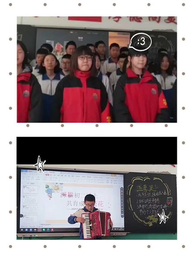 温情环节更是让现场暖意融融:孩子们带来了唱歌、手风琴演奏、朗诵等精彩表演,用才艺展现青春风采;期中表彰环节,获奖学子接过荣誉,既是对努力的肯定,也为同学们树立了榜样;而“孩子给家长写信、家长提笔回信”的环节,更是让许多家长红了眼眶,纸笔间的文字成为亲子间最真挚的情感纽带,让教育的温度在书信中传递。从理性的分析到感性的共鸣,初二家长会让家长们既明晰了孩子的学习状况,也感受到了家校共育的温暖力量。