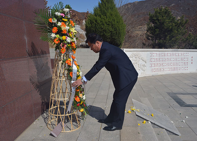 烈士忠魂贯苍穹,白云轻抚伴从容。胡晓峰董事长整理花篮缎带。