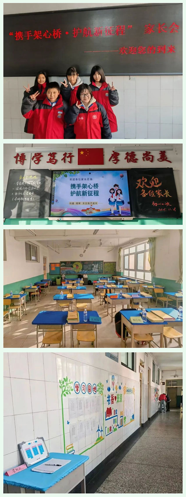 初冬的校园,因这场家校之约暖意流转。教室窗明几净,黑板上的欢迎语满是温度,每张课桌都似在期待“重要嘉宾”的到来;走廊间,孩子们的学习印记静静陈列,从课堂的专注瞬间到作业的工整笔迹,处处都是成长的注脚。这一番精心铺陈,只为架起家校间的心意之桥,为孩子的青春新征程,绘就温暖的开篇。