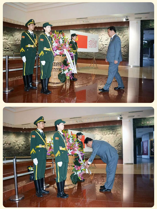 敬献花篮环节,现场奏响气势恢宏又满含悲壮的乐曲,国旗班同学迈着铿锵有力的步伐,将花篮敬献至李大钊同志雕像前,渤海中学董事长胡晓峰亲自上前整理花篮缎带,动作庄重肃穆,寄寓着渤海中学全体师生对革命先驱的深切缅怀与崇高敬意。随后,全体师生肃立鞠躬,在静默中追思先烈革命事迹,感悟初心使命。