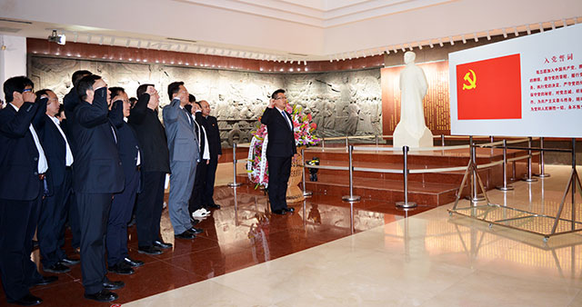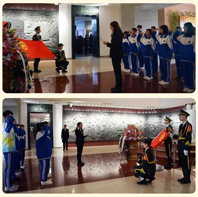 李天亮同志带领全体党员教师重温入党誓词,共青团员、少先队员也依次在领誓人的带领下庄严宣誓。师生们昂首挺胸、声音洪亮,字字千钧彰显着渤海党员教师的教育初心与责任担当,少年意气风发传递着勇担时代使命的坚定信念,三代人的誓言在纪念馆大厅久久回荡,红色信仰在每一位渤海师生心中深深扎根。