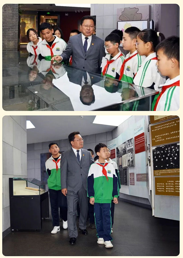 誓言落幕,全体师生跟随专业讲解员深入参观纪念馆,在40分钟的细致讲解中,走进李大钊同志为追求真理、为民族解放和人民幸福不懈奋斗的革命一生。馆内一幅幅泛黄的历史图片、一件件承载革命记忆的文物、一段段感人至深的英雄事迹,让师生们沉浸式感悟革命先驱的崇高理想和坚定信念。大家驻足凝视、认真聆听,时而低声交流感悟,时而默默记录要点,接受了一次深刻的思想洗礼和红色教育。参观过程中,董事长胡晓峰为少先队员讲解李大钊故居模型的温情画面,成为馆内最动人的红色瞬间。